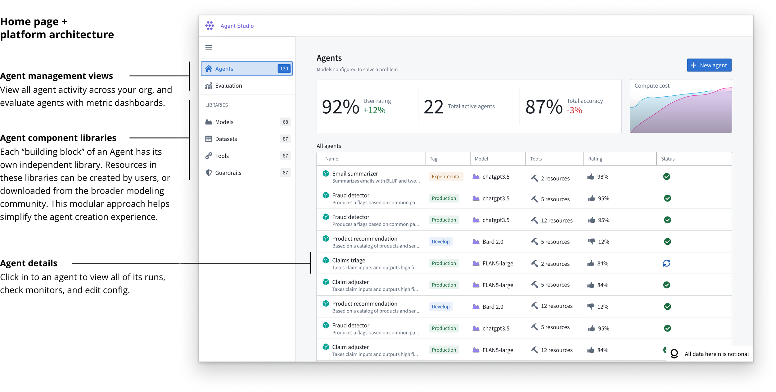 I pitched the vision to fellow designers, teammates, and coworkers. The modeling team assembled a small crew of four engineers and gave us 6 weeks to prototype the platform to see if this was worth further investment. We built the agent configuration sandbox and some of the testing functionality before having to pause on the project. The following are screen recordings of the app: