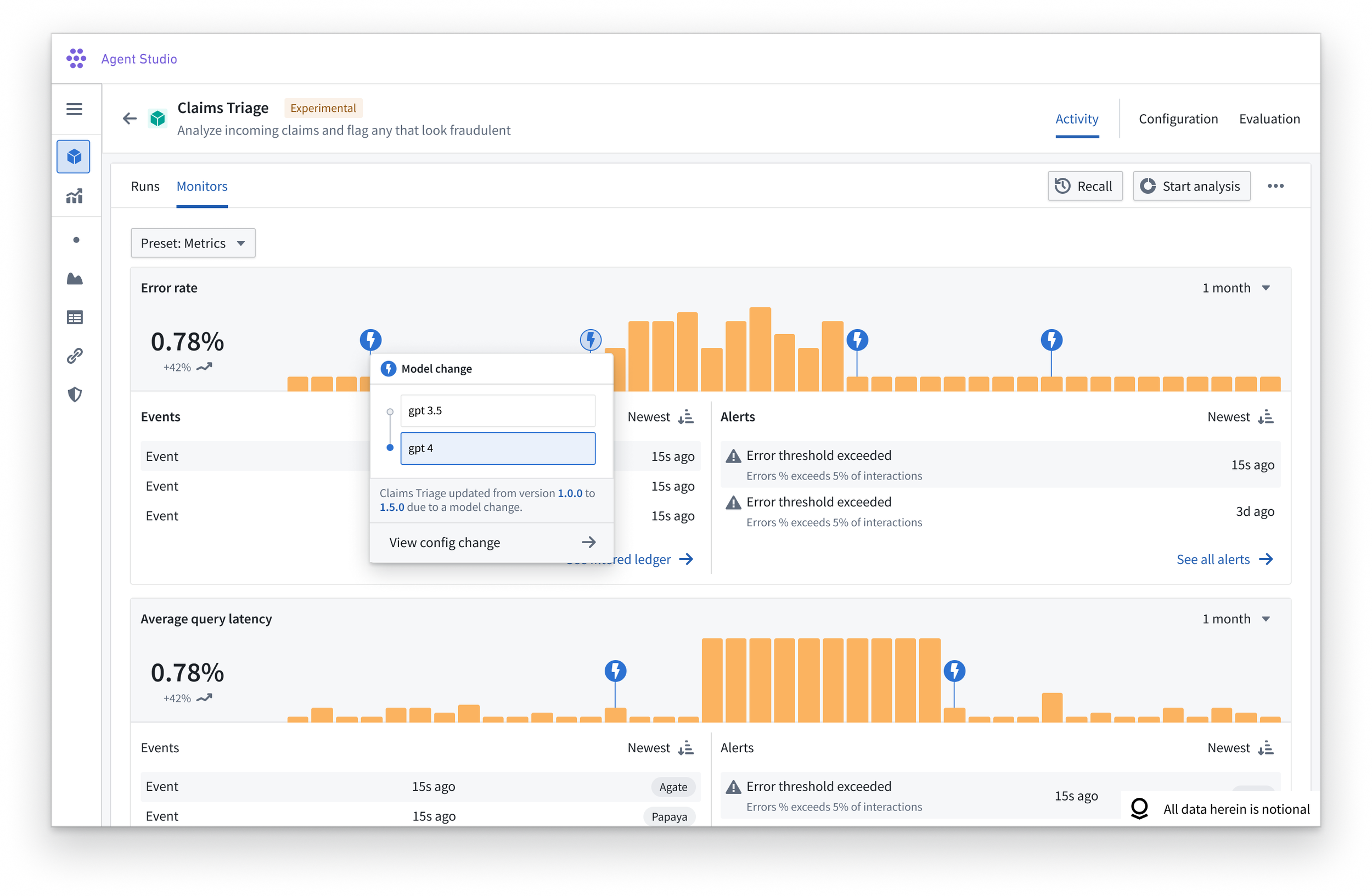 Flip to the “monitors” tab to see an agent’s performance against key metrics over time, like errors or latency. Users can also see how changes in the agent configuration impacted those monitors to ensure quality is upheld as the agent gets updated.