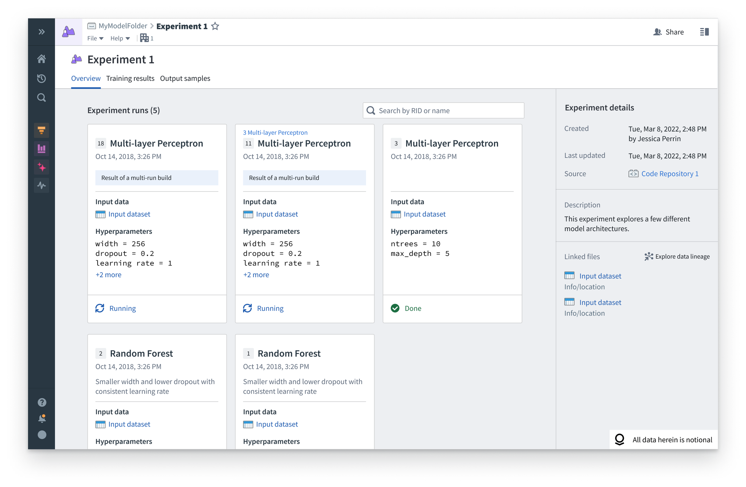 The Experiment home page lists runs as cards so users can see high-level identifying information at a glance. There are a few card variations based on run type (see below ↓)