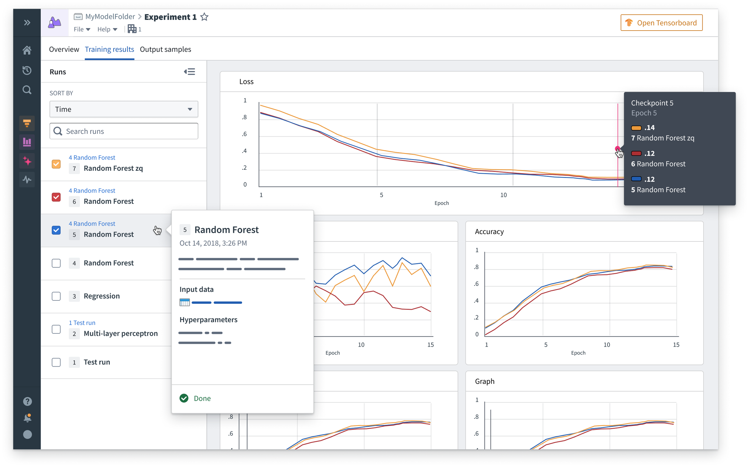 The training results page helps users compare multiple runs across the same metrics. All runs are listed in the left pane, and charts appear on the right for any logged metrics. Users can toggle each run on and off, which will make its data appear on the relevant metric cards.